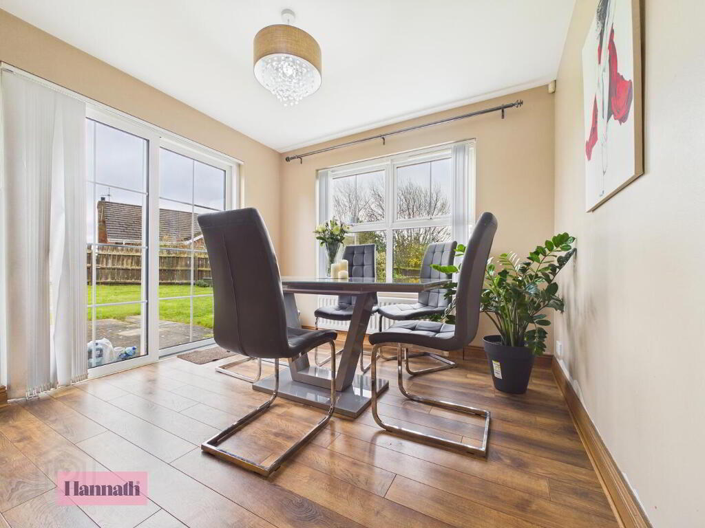 - Adjoining the kitchen is a dining area featuring a wood-effect floor and large windows with French doors that open to the rear garden, creating a seamless connection between indoor and outdoor living. This space is perfect for enjoying family meals or entertaining guests with views over the garden.