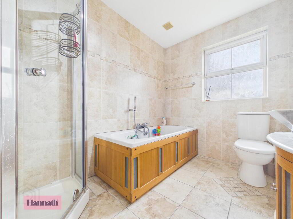 - The family bathroom features a panelled bath, separate shower cubicle, and a modern vanity unit with a basin. Light neutral tiling on the floors and walls enhances the sense of space and cleanliness, complemented by a frosted window providing natural light.