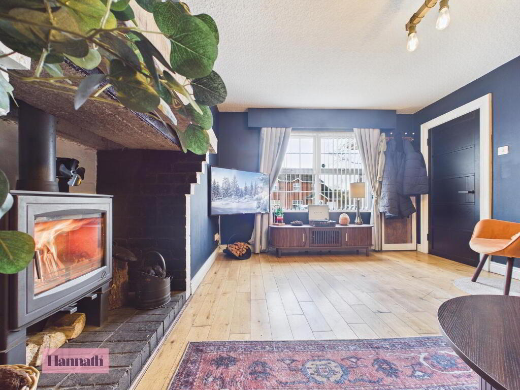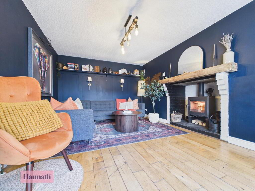 - This living room offers a cosy atmosphere with dark painted walls providing a striking contrast to the light wood flooring. A large window at the front of the house floods the room with natural light. The focal point is a wood-burning stove set within a brick fireplace, creating a warm and inviting space for relaxation.