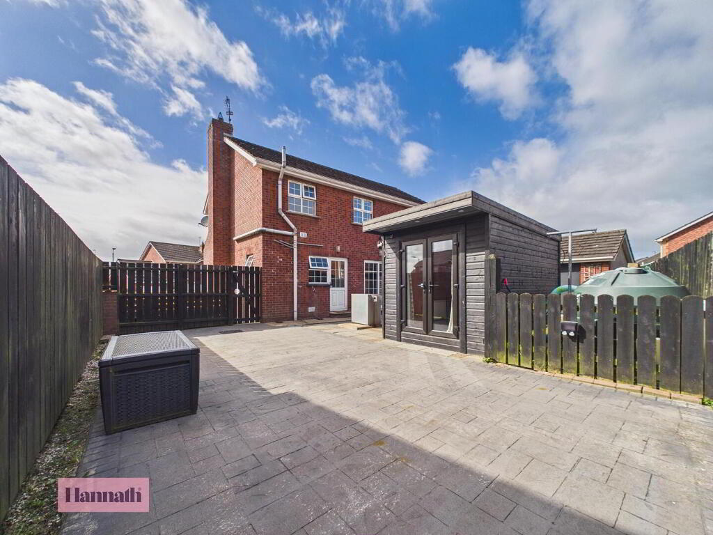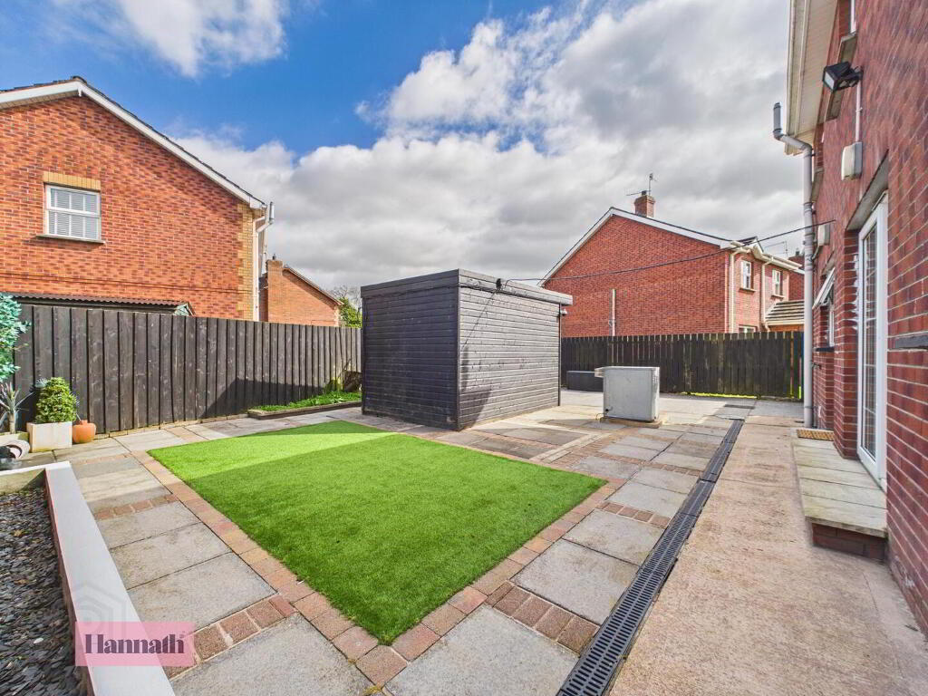 - The rear garden features a low-maintenance design with a mix of paved patios and an artificial grass lawn, ideal for relaxing or entertaining. It is enclosed by dark fencing for privacy, with a sizeable shed and the garden office providing useful outdoor storage and workspace.