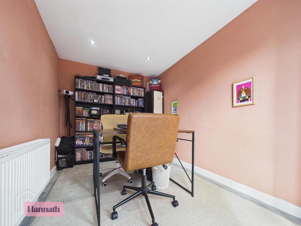 - This room is currently used as a study, featuring calming terracotta walls and neutral carpeted flooring. It includes patio doors that open to the garden, allowing natural light to flood the space, making it an ideal home office.