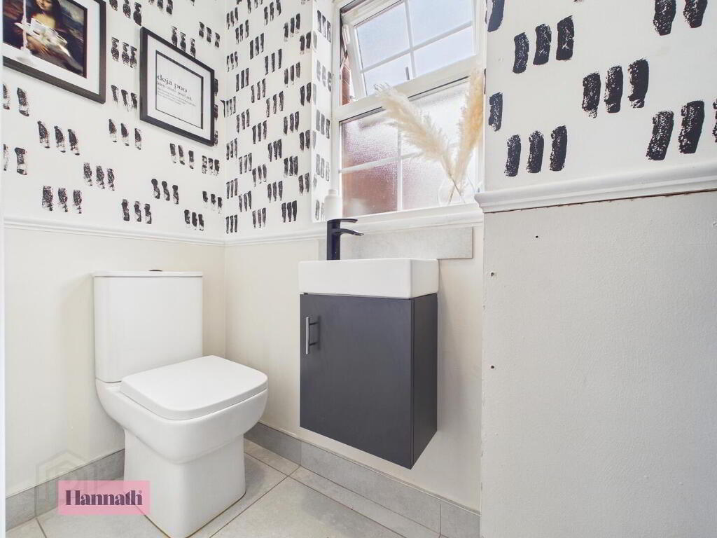 - This WC is compact yet practical, featuring a modern toilet and a wall-mounted basin housed in a dark cabinet. The floor is tiled, and a frosted window ensures privacy while bringing in natural light.