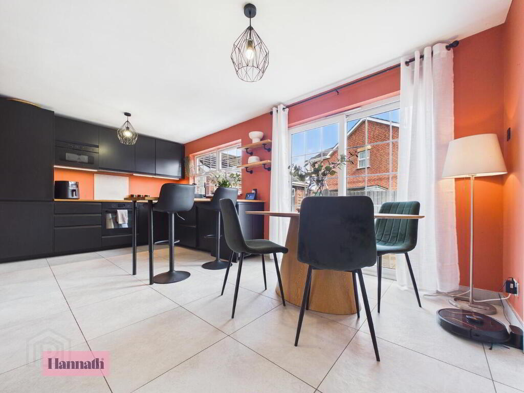 - The kitchen is a standout room with vibrant terracotta walls which add warmth and personality. It features sleek black cabinetry with integrated appliances and wood-effect work surfaces. Large windows and a glass door provide ample natural light and access to the rear garden, while tiled flooring enhances the contemporary feel. A breakfast bar with seating offers a casual dining option within this well-designed kitchen space.