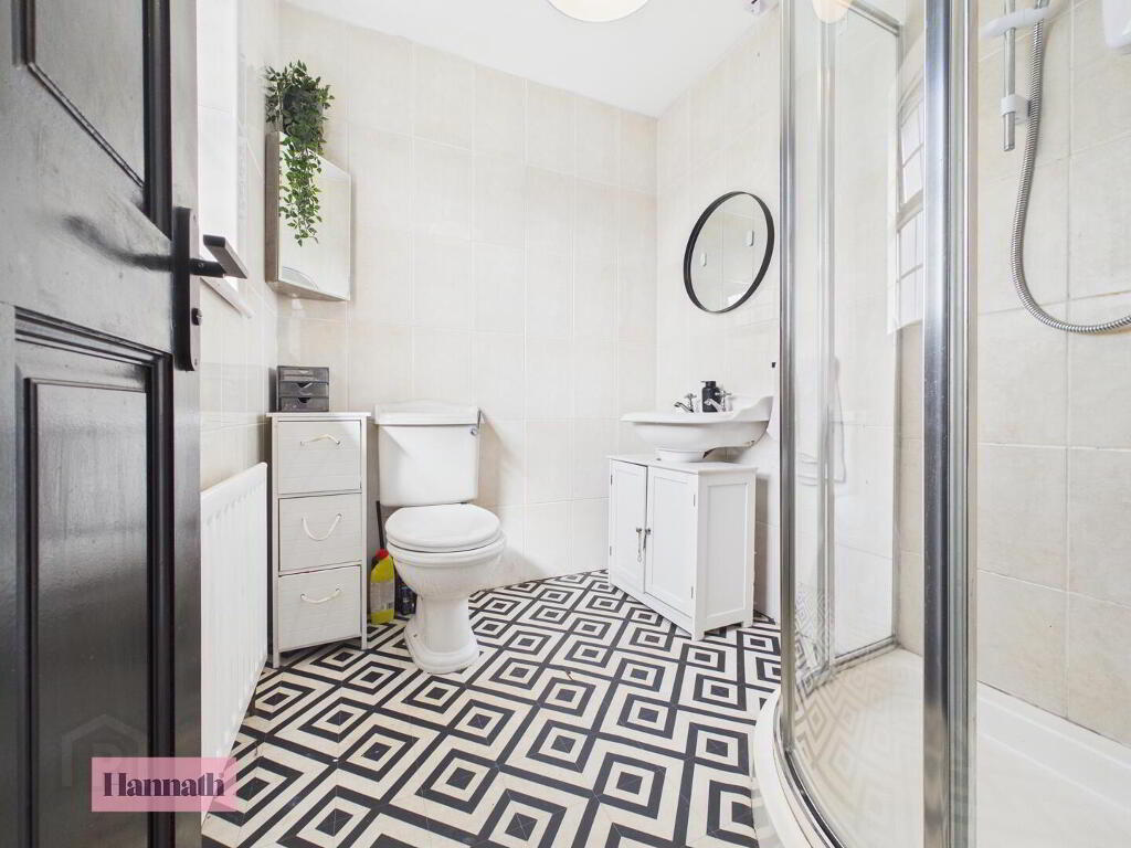 - The en-suite is fitted with a modern shower, basin vanity unit, and toilet. It is practical and compact.