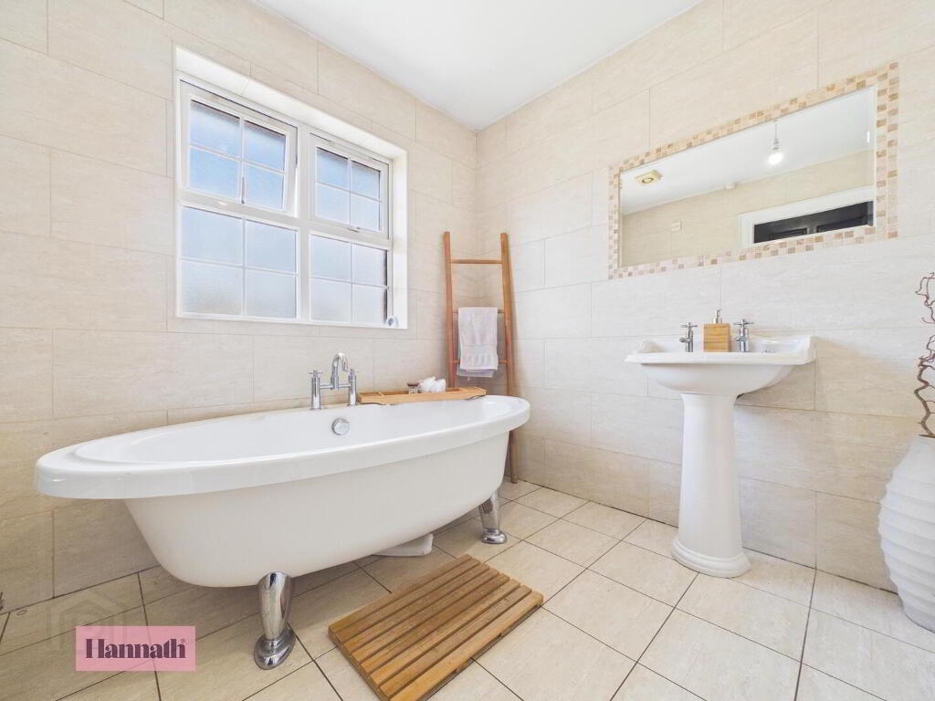 - The main bathroom is spacious and bright, featuring a freestanding clawfoot bath, a separate walk-in shower, pedestal basin, and toilet. The walls and floor are tiled in neutral shades, creating a clean and relaxing space.