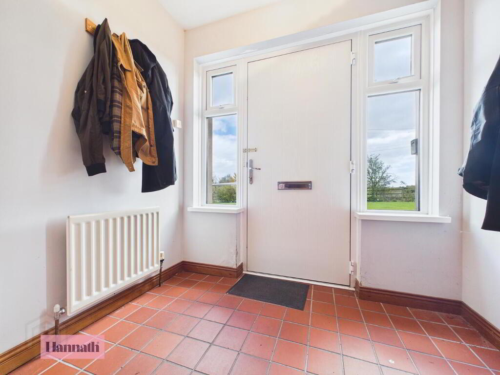 The entrance opens into a welcoming hall with natural light from side windows, featuring terracotta floor tiles and space for coats and shoes.