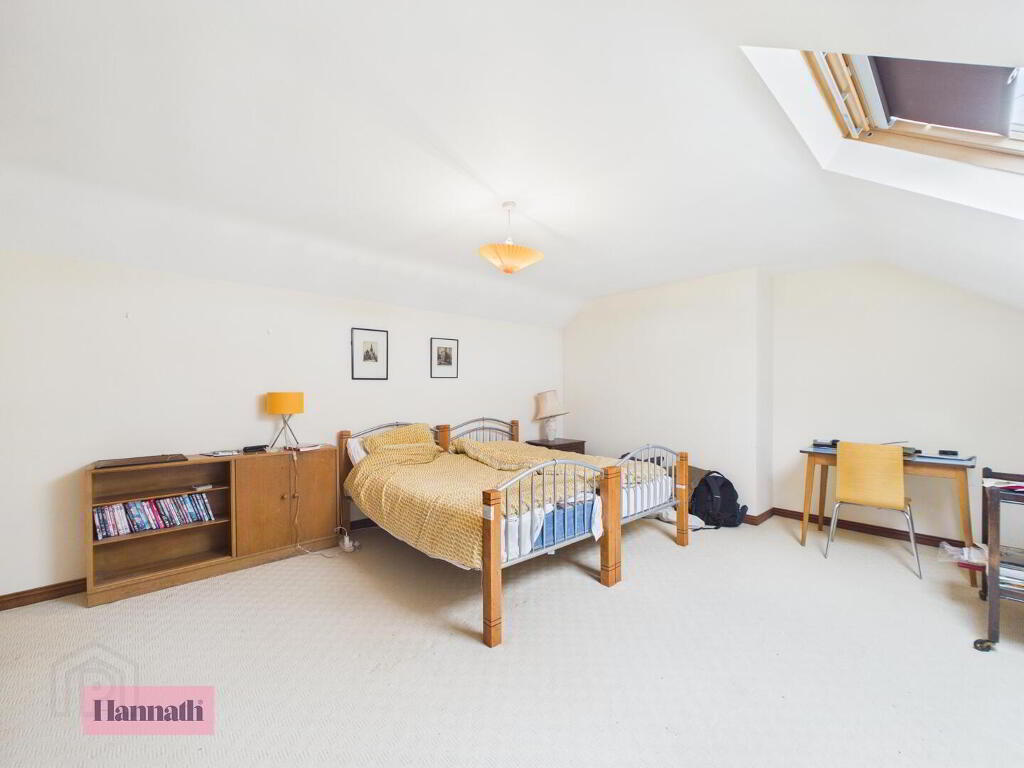 Bedroom 3 is a large, airy room with high ceilings and a skylight window providing natural light. Its generous proportions offer plenty of space for a double or king-size bed and additional furniture, creating a comfortable retreat on the first floor.