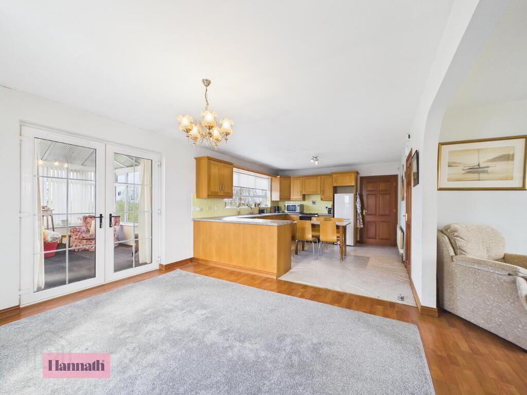 The kitchen and dining area is a generous, open space with a mix of flooring types separating the cooking and dining zones. It features a wide window over the sink, oak cabinetry, and space for a table and chairs. Double doors lead into the conservatory, while an adjacent door gives access to the utility room. The kitchen is well-lit and ideal for both everyday meals and entertaining.