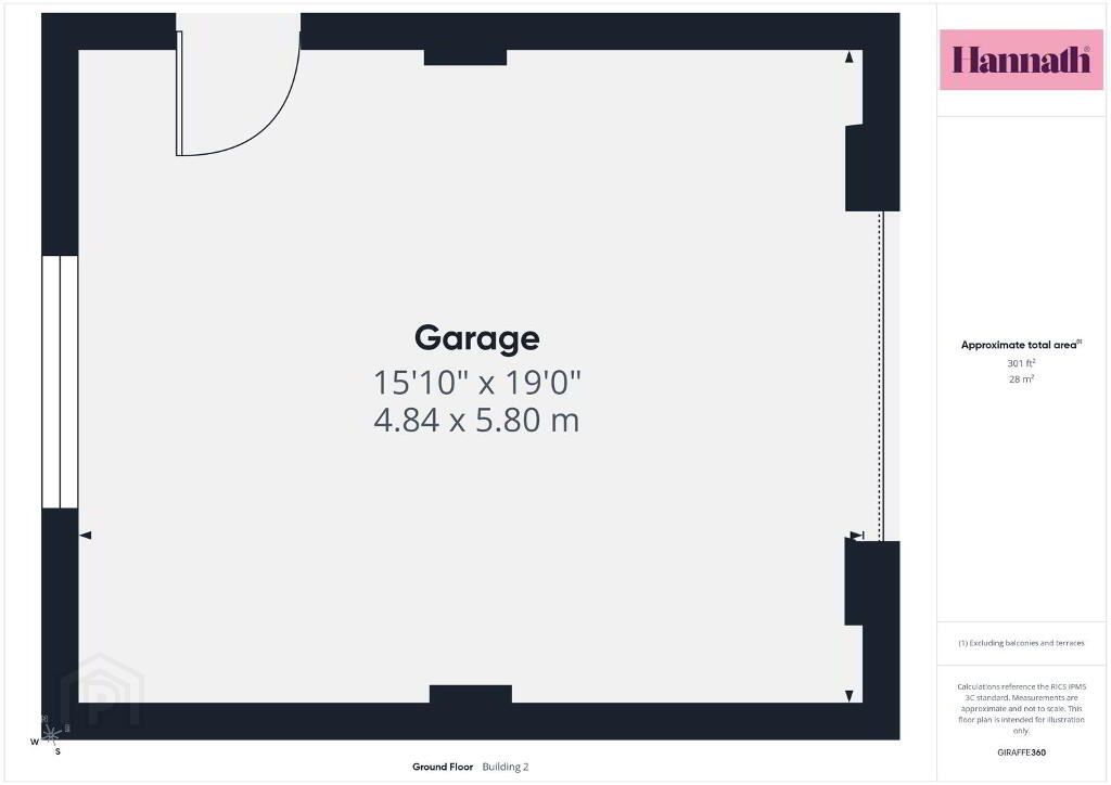 The garage is a detached, substantial space with measurements allowing for parking and storage. It has windows and a door providing outside access, suitable for cars and additional utility needs.
