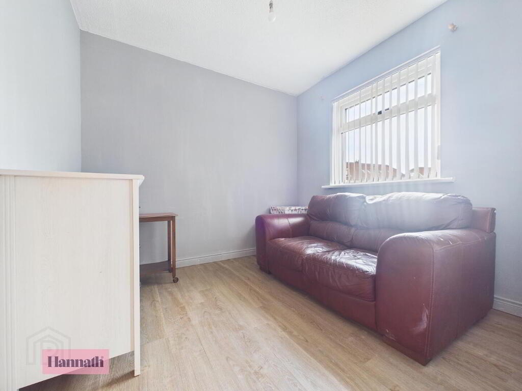 A cosy reception room featuring a modest footprint with wood laminate flooring and a large window that brightens the space. The room is simply decorated, offering a quiet area that could serve perfectly as a study or additional sitting area.