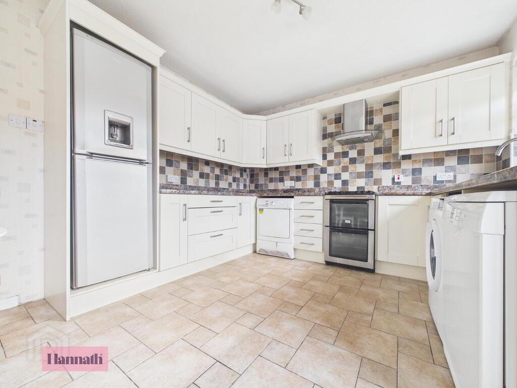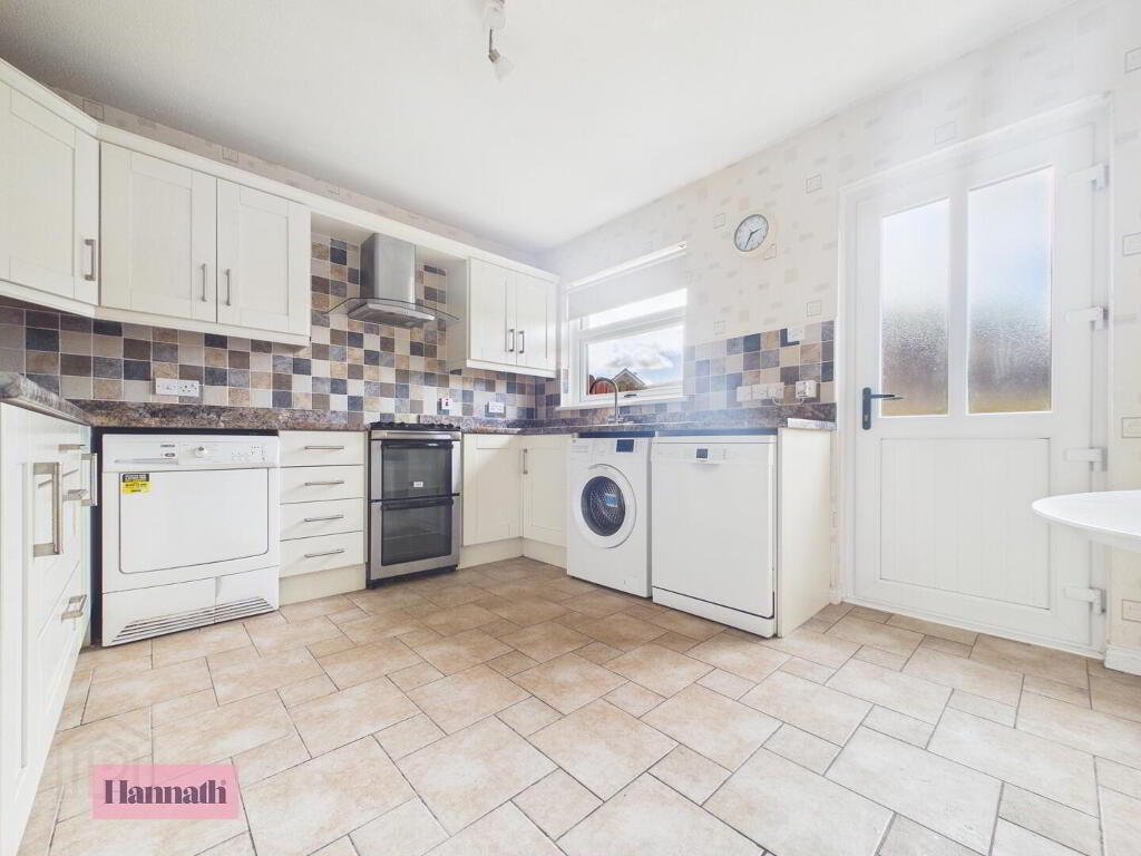 A well-proportioned kitchen with a practical layout, featuring a combination of high and low level units. Space for appliances include a fridge and oven, alongside space for a washing machine and dishwasher, with a door leading directly outside.