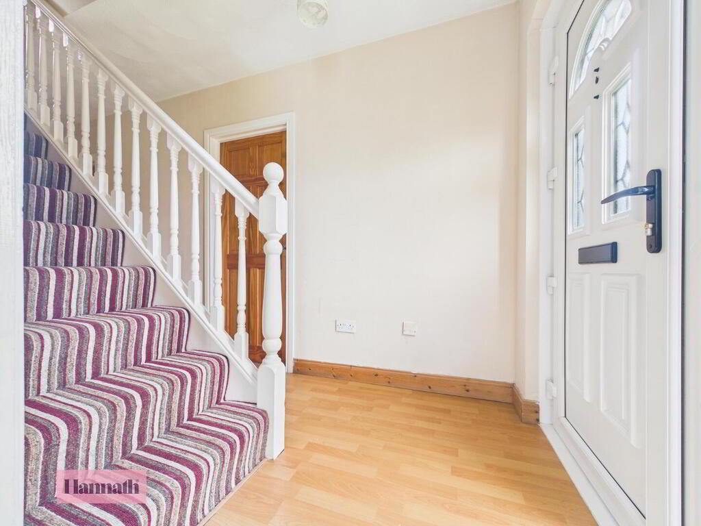 A welcoming hallway featuring warm wooden flooring and a staircase with a classic white banister, providing access to the upper floor. Natural light filters through a white front door with glazed panels, creating a bright entrance.