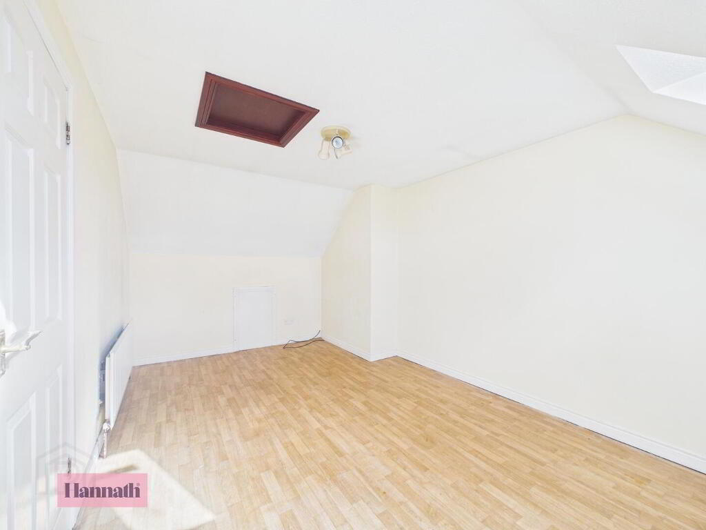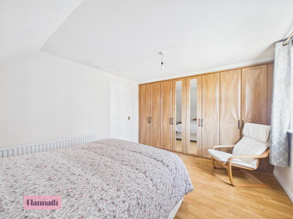This spacious bedroom on the upper floor is bright and airy with natural wood flooring and a large window. The room benefits from plenty of built-in storage with fitted wardrobes and offers a tranquil space for rest and relaxation.
