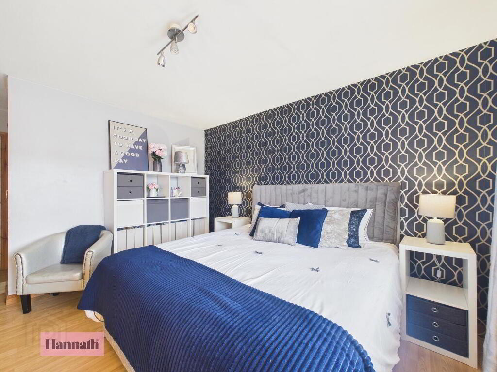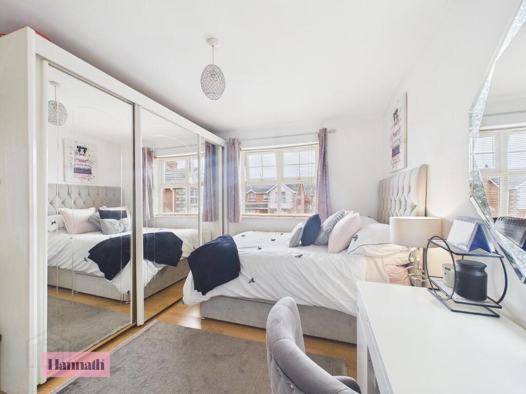 Bedroom 1 is a generous double room with wood flooring, a large window for natural light, and a walk-in wardrobe providing ample storage. It benefits from a modern en-suite shower room, adding privacy and convenience.