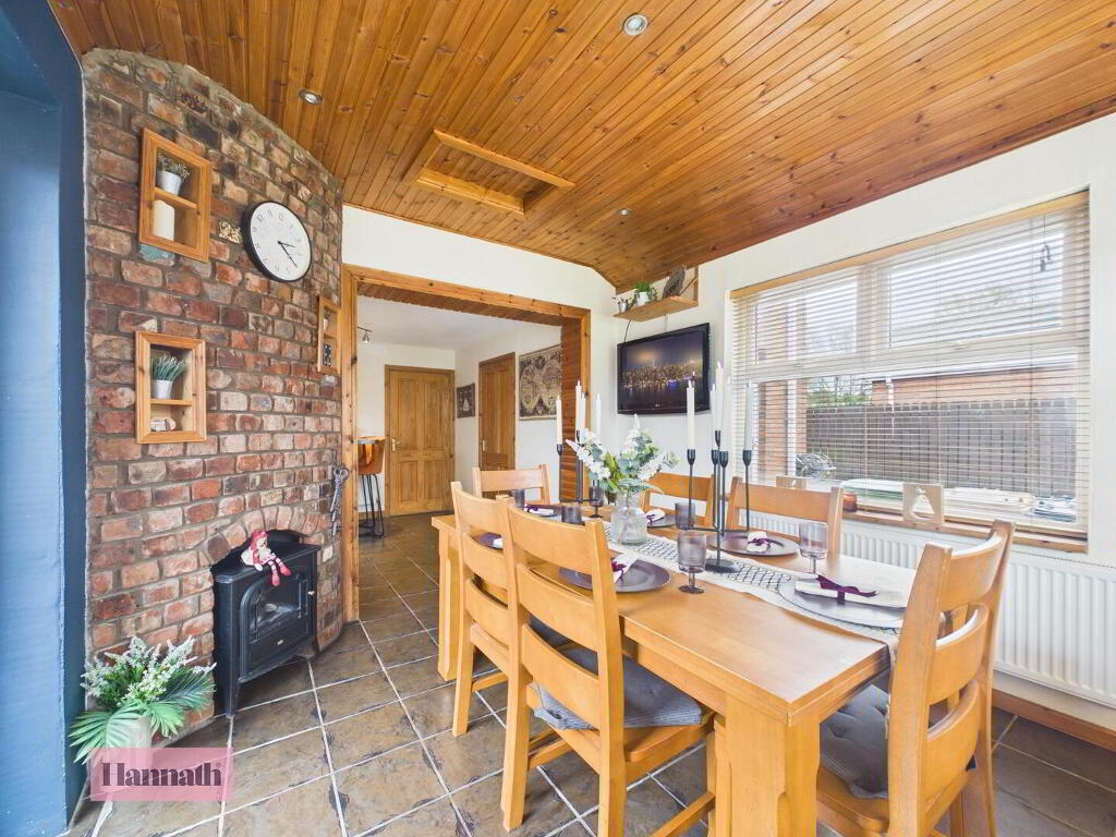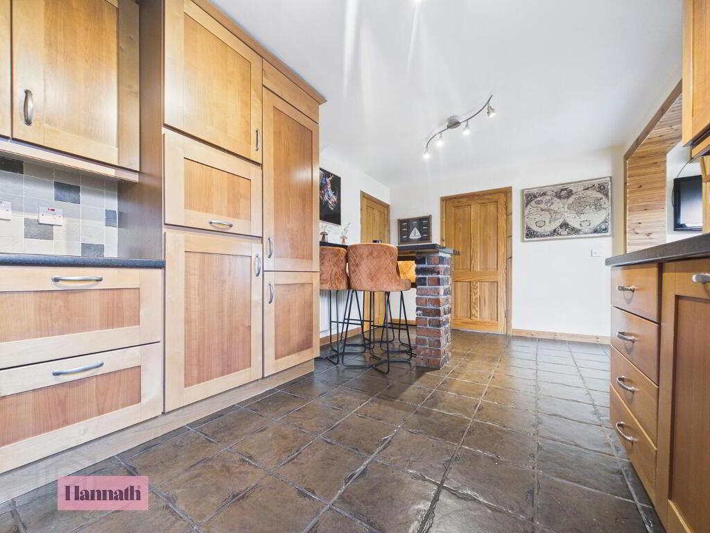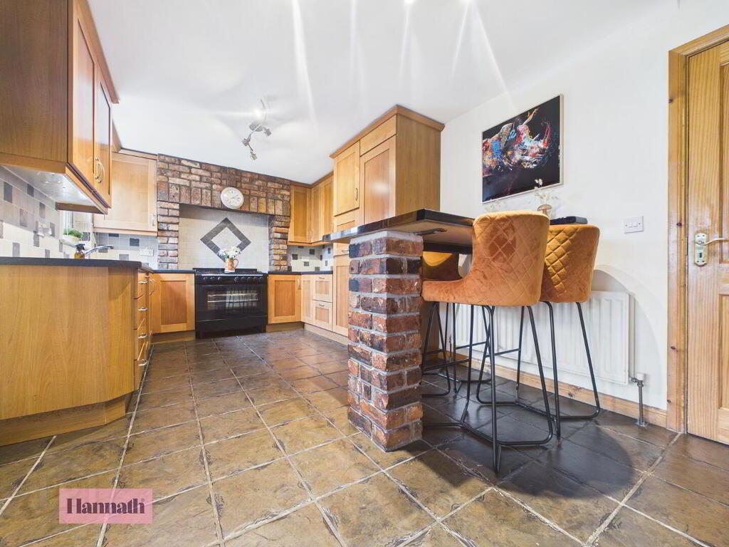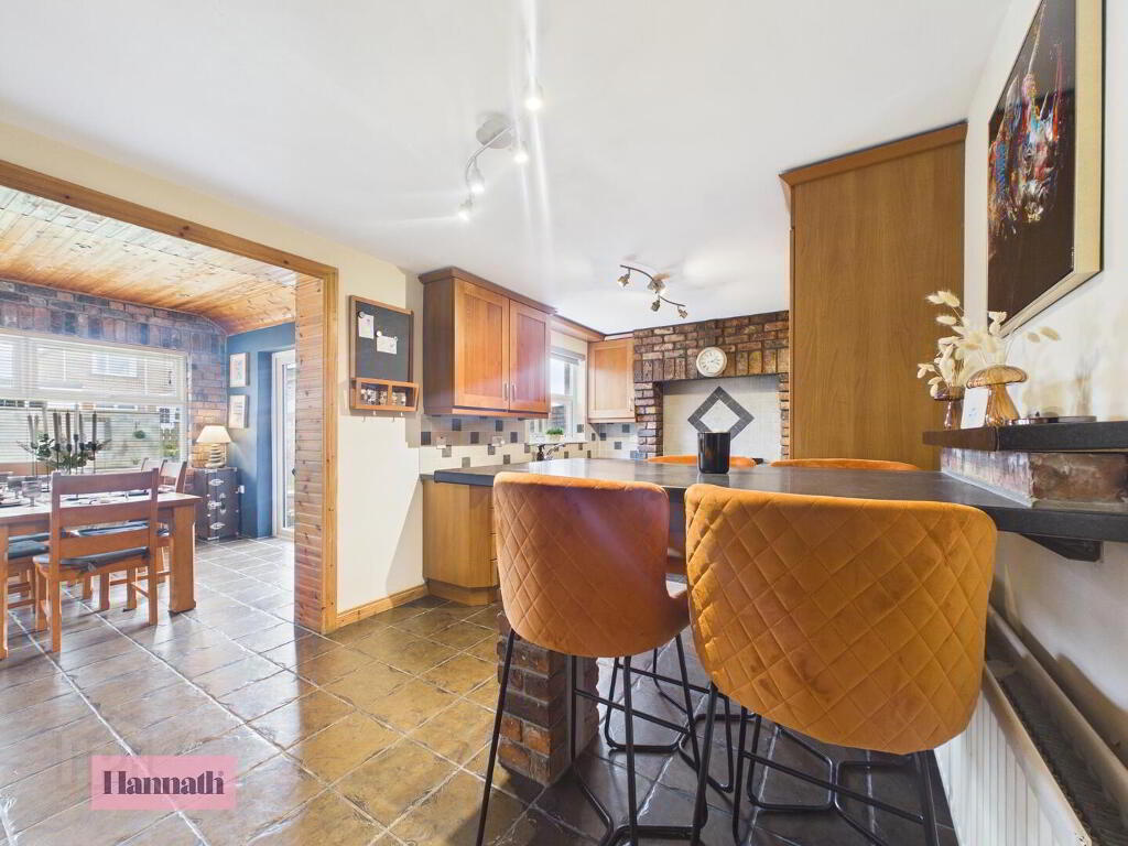 The kitchen is a well-equipped space with traditional wood cabinetry and tiled flooring that extends through the room. It features a breakfast bar with seating, offering both practicality and a sociable spot for casual dining. The kitchen flows seamlessly into the dining room and has access to the utility room.