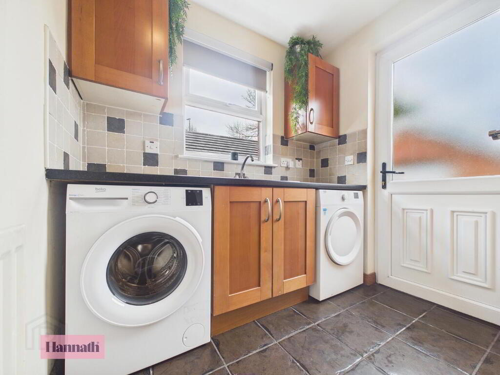 The utility room is practical and well-appointed, featuring tiled floors and wood cabinetry to match the kitchen. It houses a washing machine and tumble dryer beneath the worktops and offers direct access to the side of the property.