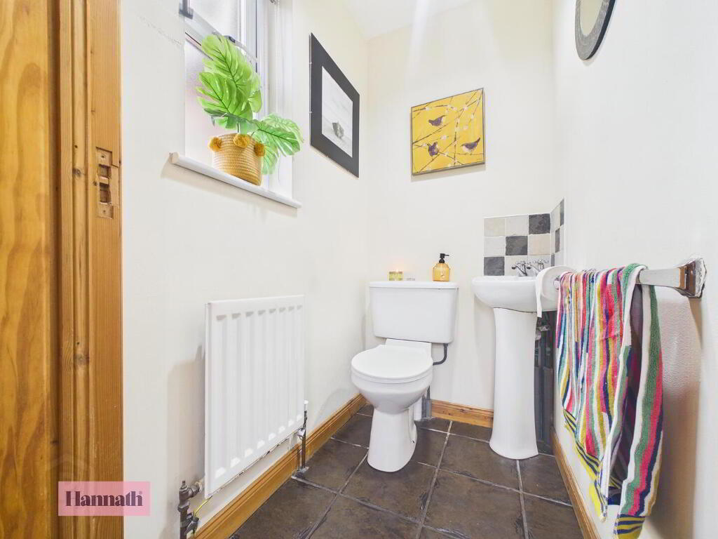 This downstairs w.c. is neatly finished with tiled flooring and white fixtures, including a WC and pedestal basin.