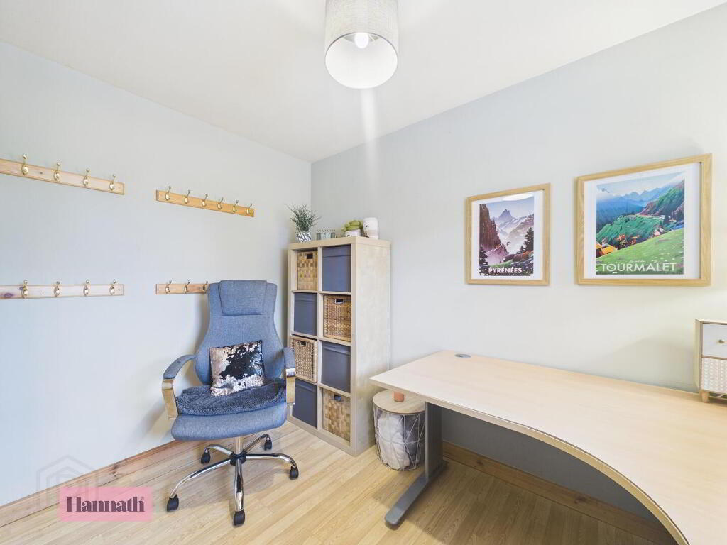The office offers a peaceful working environment, featuring light wood flooring and white walls to ensure brightness and focus. Its compact size makes it an ideal space for productivity and organisation.