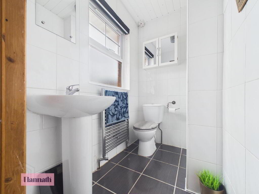 The family bathroom is tiled in dark grey and white, featuring a bath, separate corner shower cubicle, pedestal basin, and WC. The room is brightened by a window and finished with modern fittings for comfort and style.