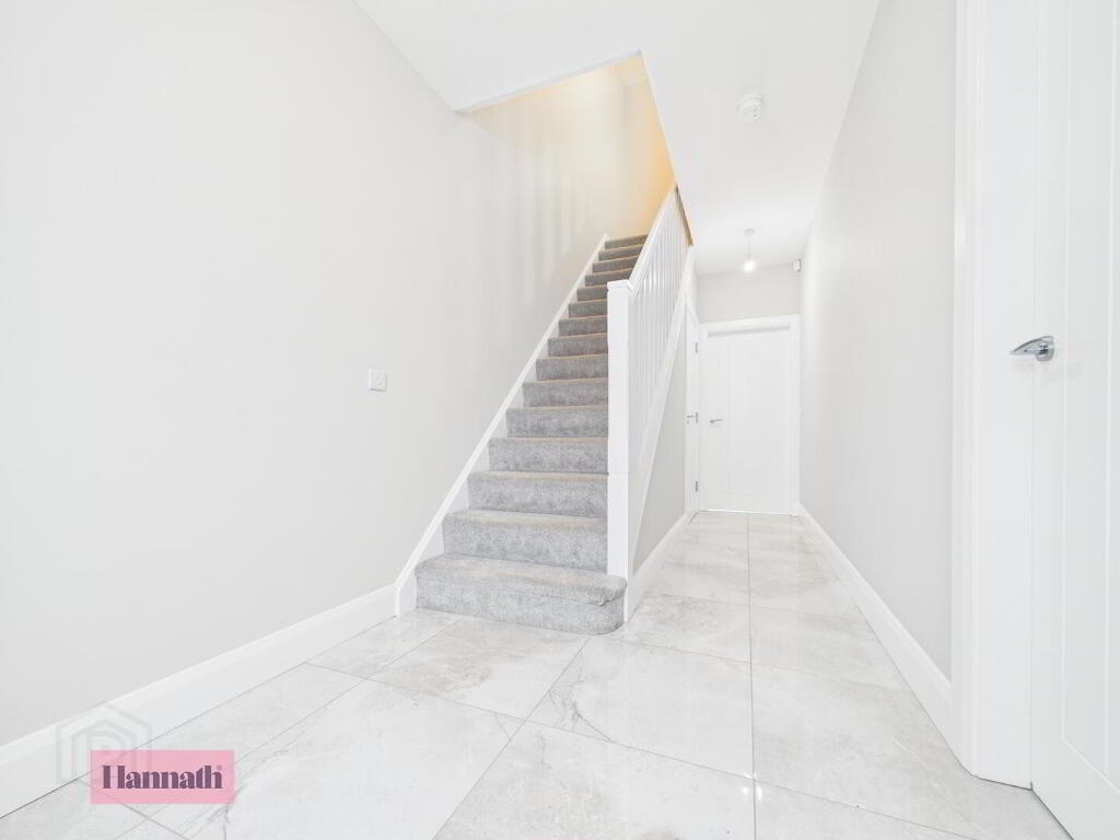The hallway presents a bright and airy welcome with sleek, light-toned tiled flooring that extends through much of the ground floor. Neutral walls and contemporary white baseboards enhance the space, complemented by a carpeted staircase ascending to the first floor, offering a neat and inviting entrance to the home.