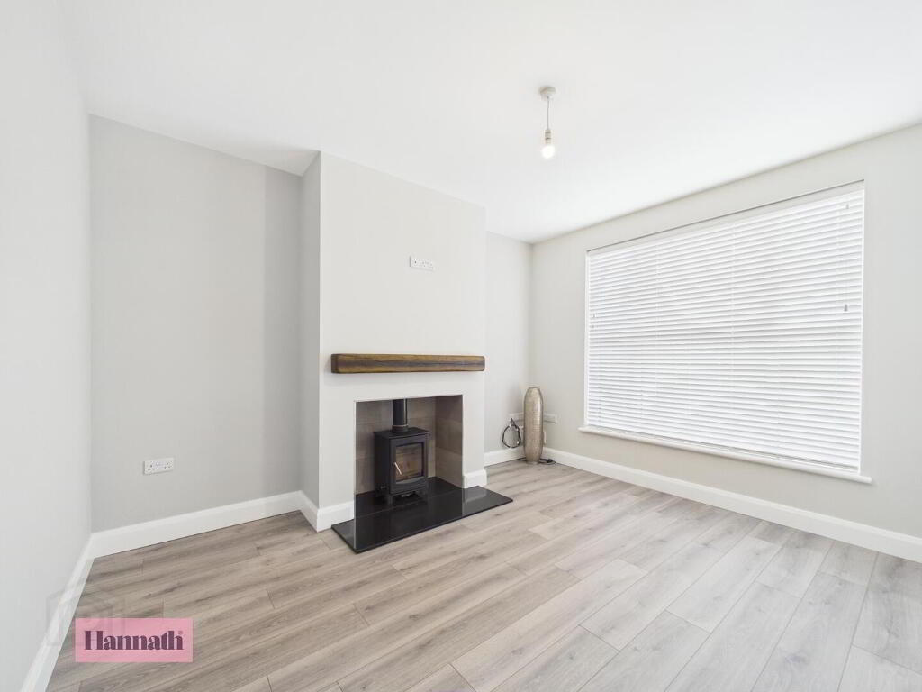 This cosy lounge is characterised by a large window that fills the room with natural light, accentuating the wood-effect flooring and soft grey walls. A charming focal point is provided by the wood burning stove with a black hearth and a wooden mantle, creating a warm and inviting space for relaxation.