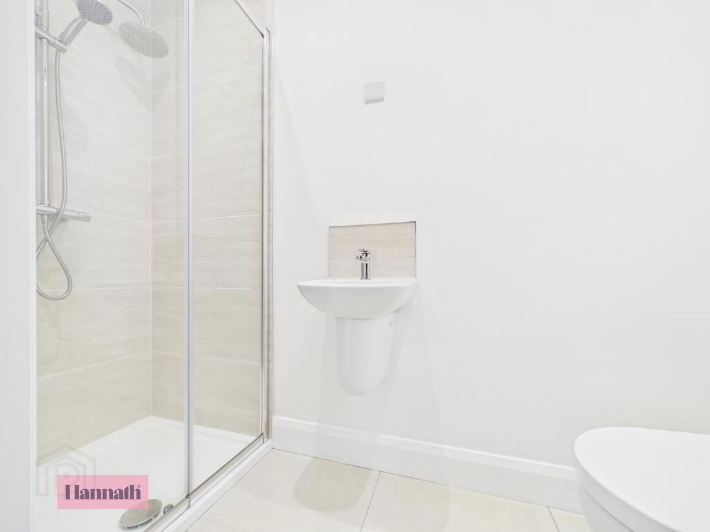 The master bedroom's en-suite shower room is compact and finished with light-coloured tiles and a contemporary white suite including a shower, basin, and toilet, offering a stylish and practical private bathroom.
