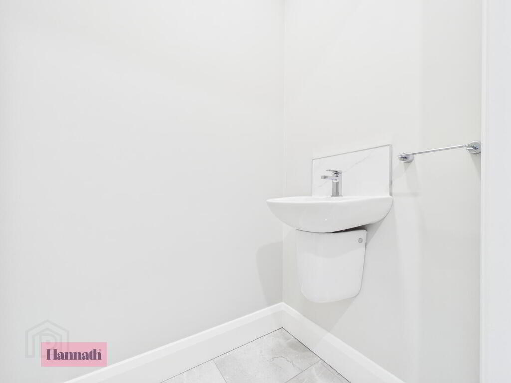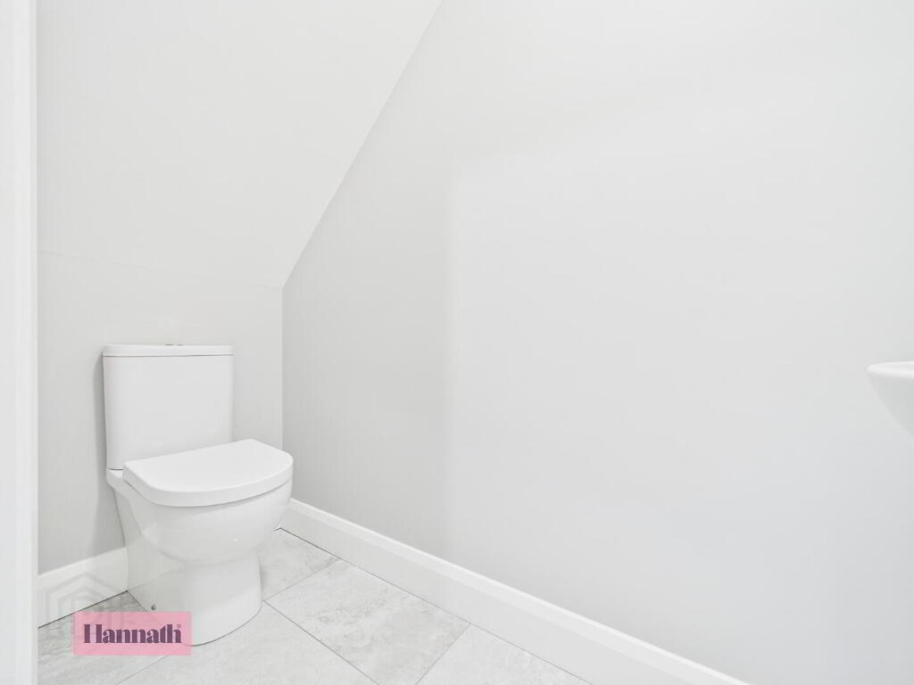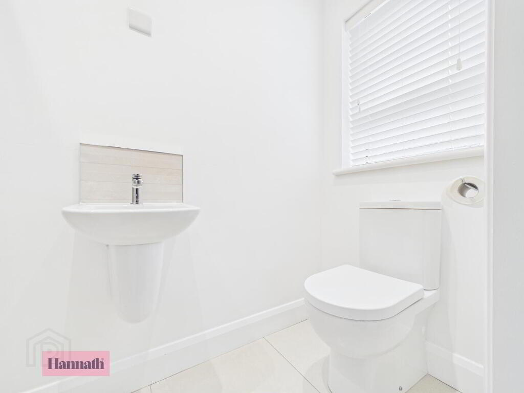 The ground floor cloakroom is presented with light neutral tiling on the floor and walls, featuring a modern white toilet and a compact wall-mounted sink. The space is kept bright and fresh with neutral walls and simple fixtures, offering practical convenience on the ground level.