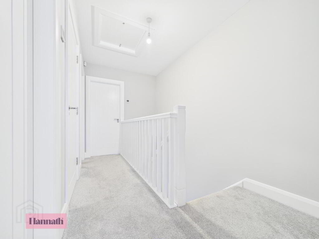 The first-floor landing is carpeted and finished in neutral tones, with a white banister providing a classic touch. It serves as a central point connecting the bedrooms and bathrooms.