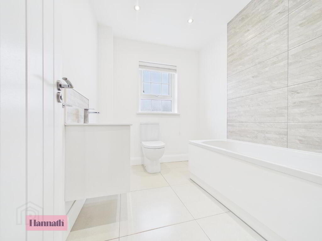 The family bathroom is bright and modern with tiled flooring and a white suite including a bath, toilet, and basin. A window provides natural light and ventilation, while the neutral tiling around the bath adds a clean and polished finish.