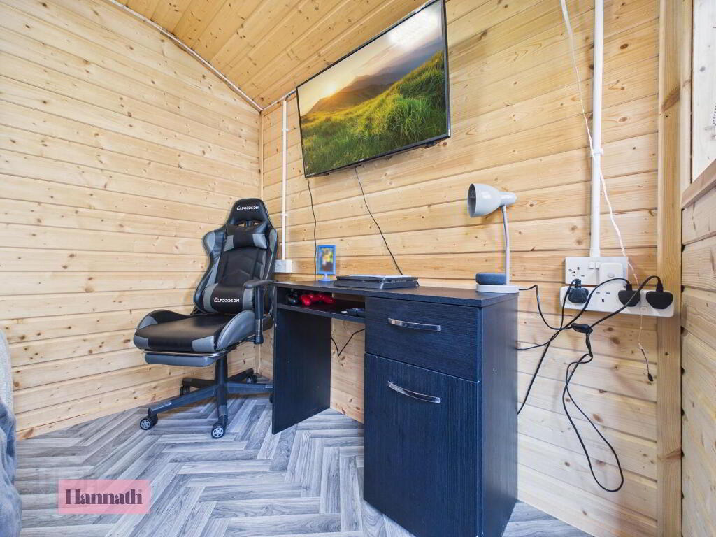 The rear garden offers a low-maintenance outdoor space featuring artificial grass and a raised decking area. It is thoughtfully arranged with two garden sheds. The garden is enclosed for privacy and includes decorative planting and seating.