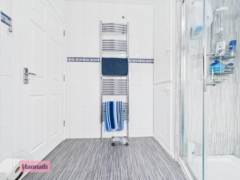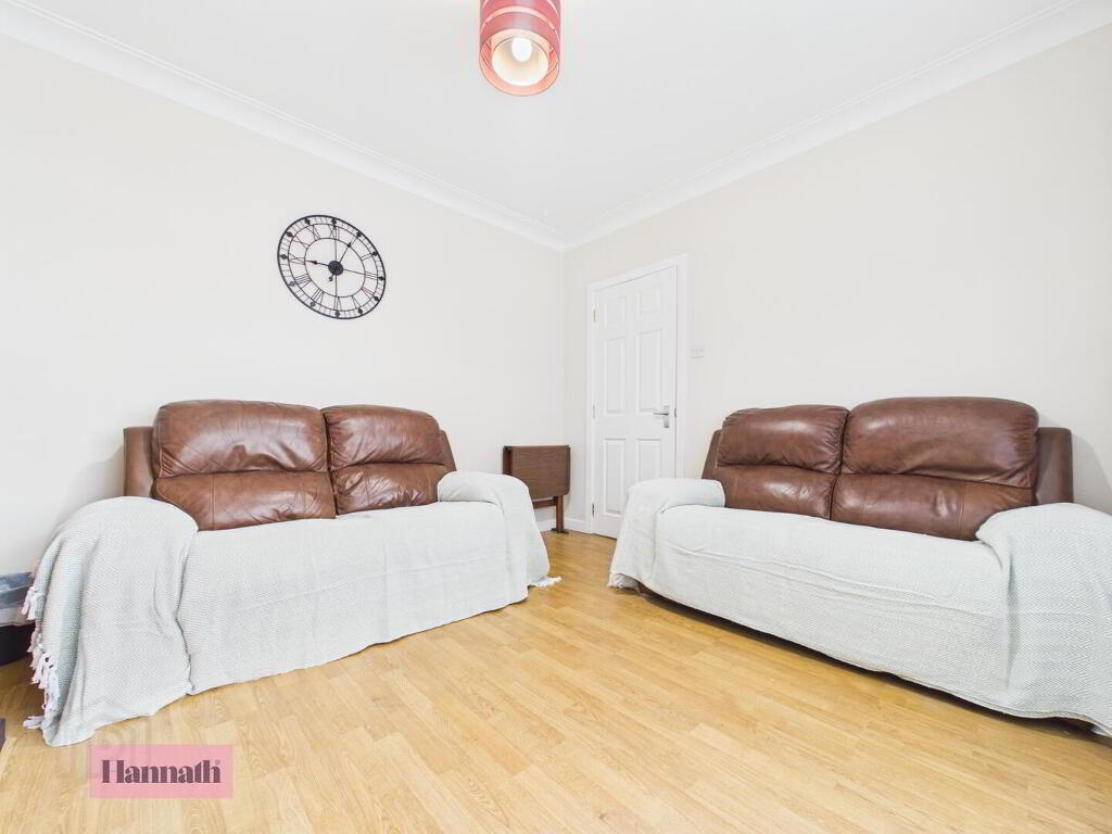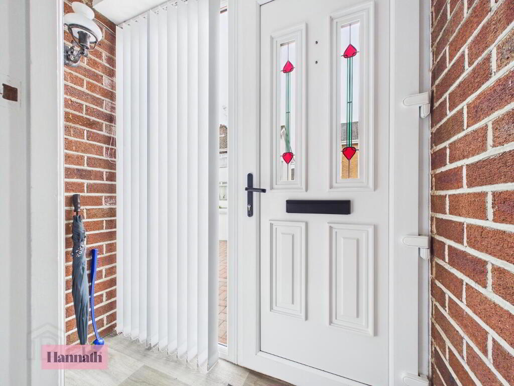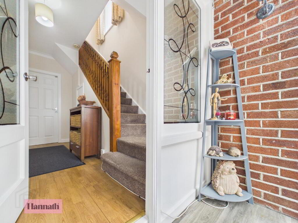 The entrance hall welcomes you with its bright and airy feel, featuring a wood laminate flooring and a white front door with decorative glazing. The space leads naturally into the main hallway, which is finished with wood-effect flooring and offers access to the staircase and adjoining rooms. A built-in storage cupboard is cleverly tucked under the staircase, adding practical storage options.