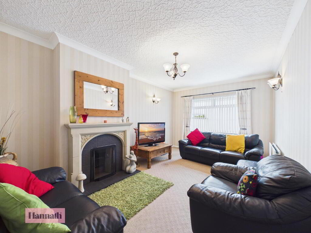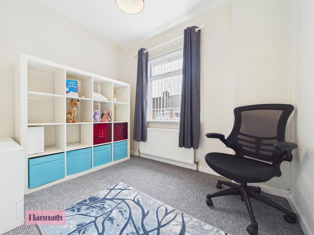 Spacious and bright, the second reception room offers a welcoming atmosphere with neutral carpeting and a decorative fireplace as a focal point. Large windows overlook the rear, allowing natural light to pour in and fill the room, making it an ideal space for family gatherings or quiet evenings.