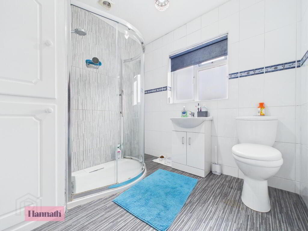 The bathroom is fitted with a modern white suite including a corner shower enclosure, a wash basin with vanity storage, and a toilet. Light wall tiles with a decorative border complement the grey wood-effect flooring, creating a fresh and practical space.