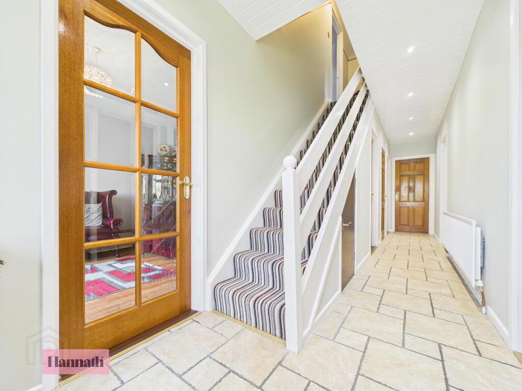 The hallway offers a welcoming entrance with tiled flooring and neutral walls. It features a pvc front door with decorative glass panels.
