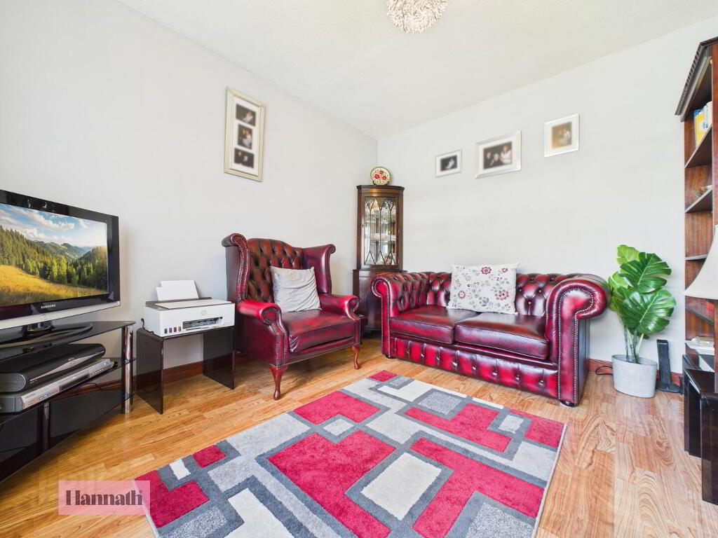 This charming living room is enhanced by a characterful wood panelled ceiling and a striking dark wood fireplace with intricate detailing and tiling. The room is naturally bright, benefiting from a large window that overlooks the front garden. The flooring is a warm wood effect, creating a cosy and traditional space perfect for relaxing.
