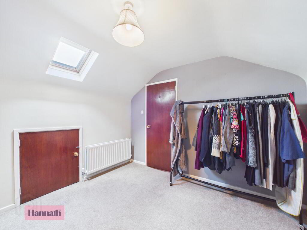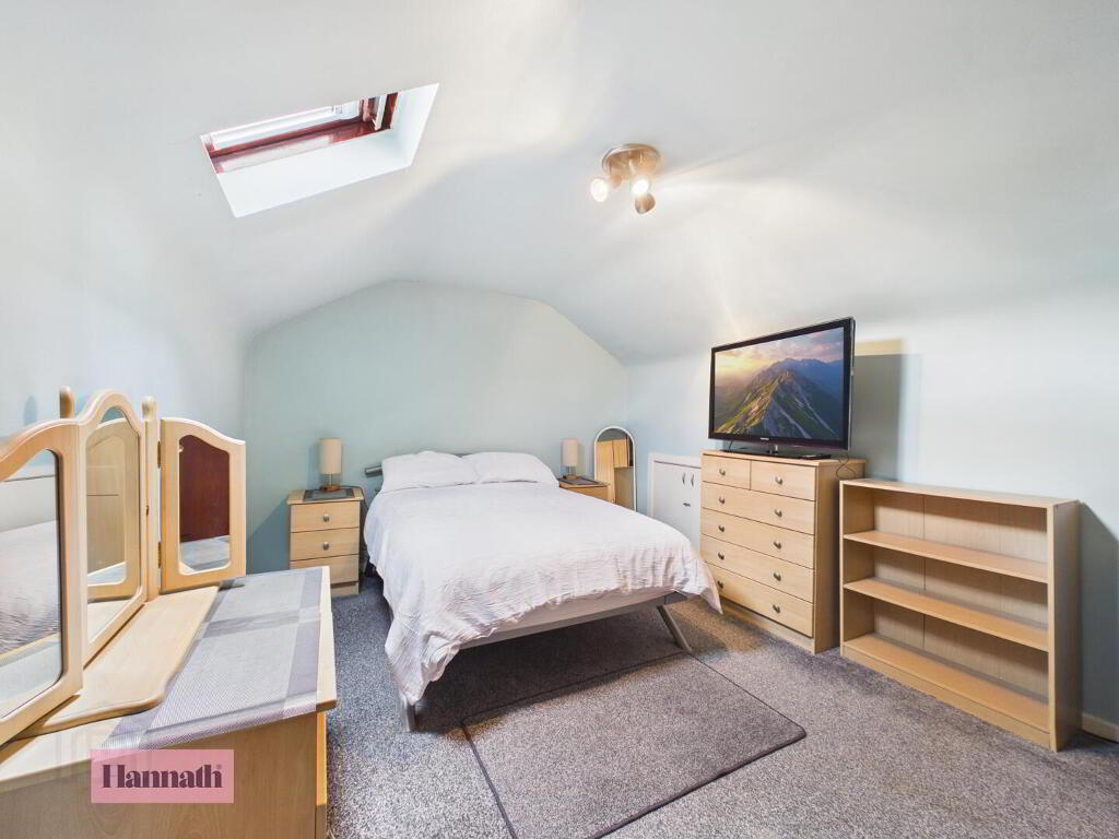 Bedroom 4 is a comfortable room located upstairs, featuring light walls and carpeted flooring. The room benefits from skylights that allow plenty of natural light and a peaceful view outside.