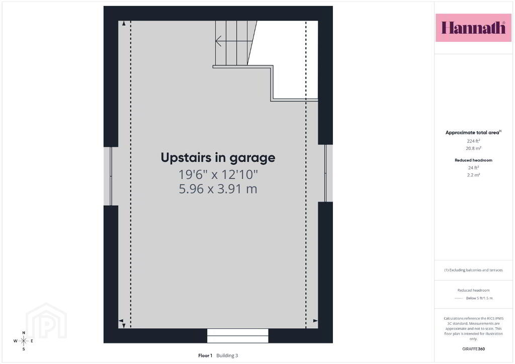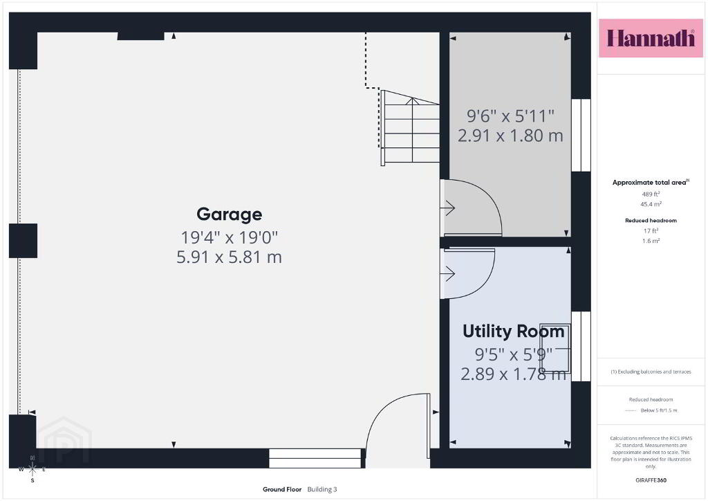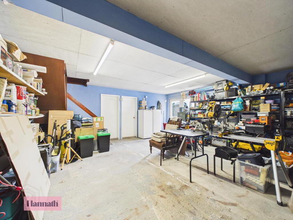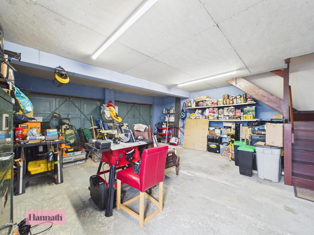 The garage is a large double space with concrete flooring. It is accessed via large double doors and includes a utility room and a staircase leading to the upper floor.