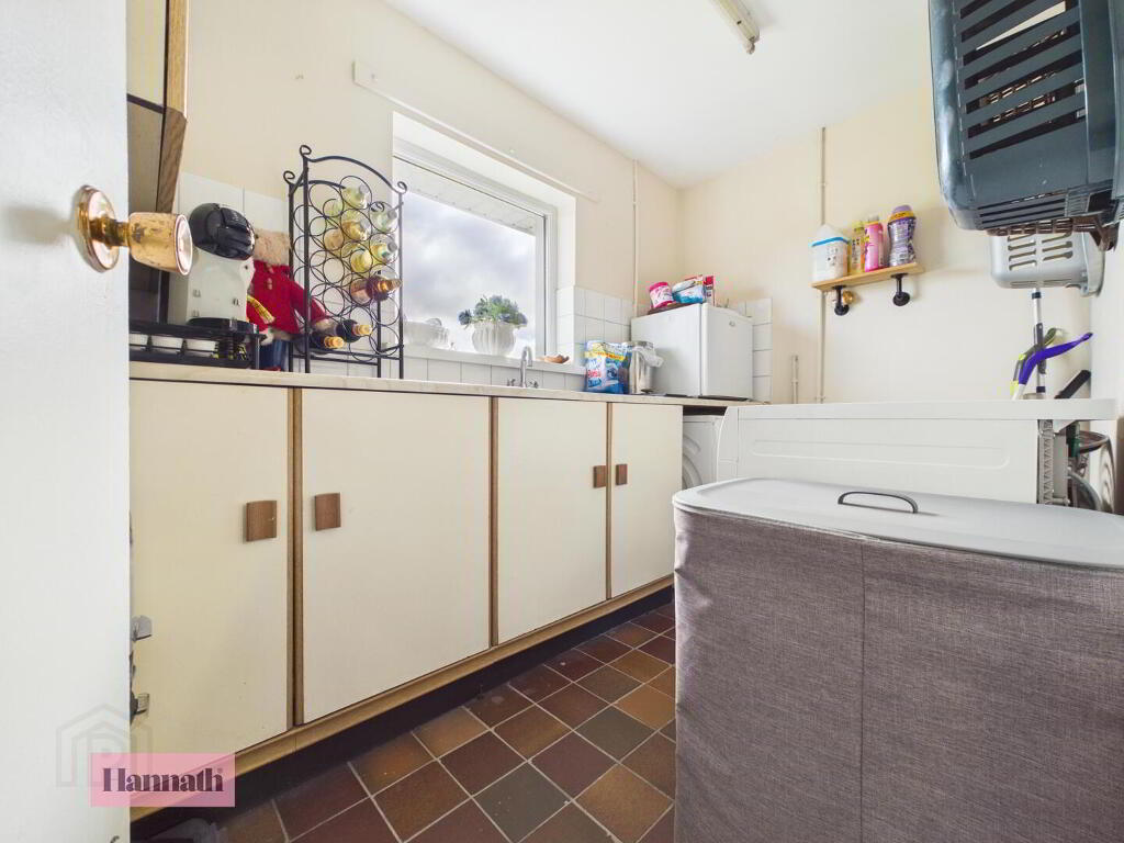 The utility room offers practical space with a window and tiled flooring. It is plumbed for a washing machine and has a range of built in units.