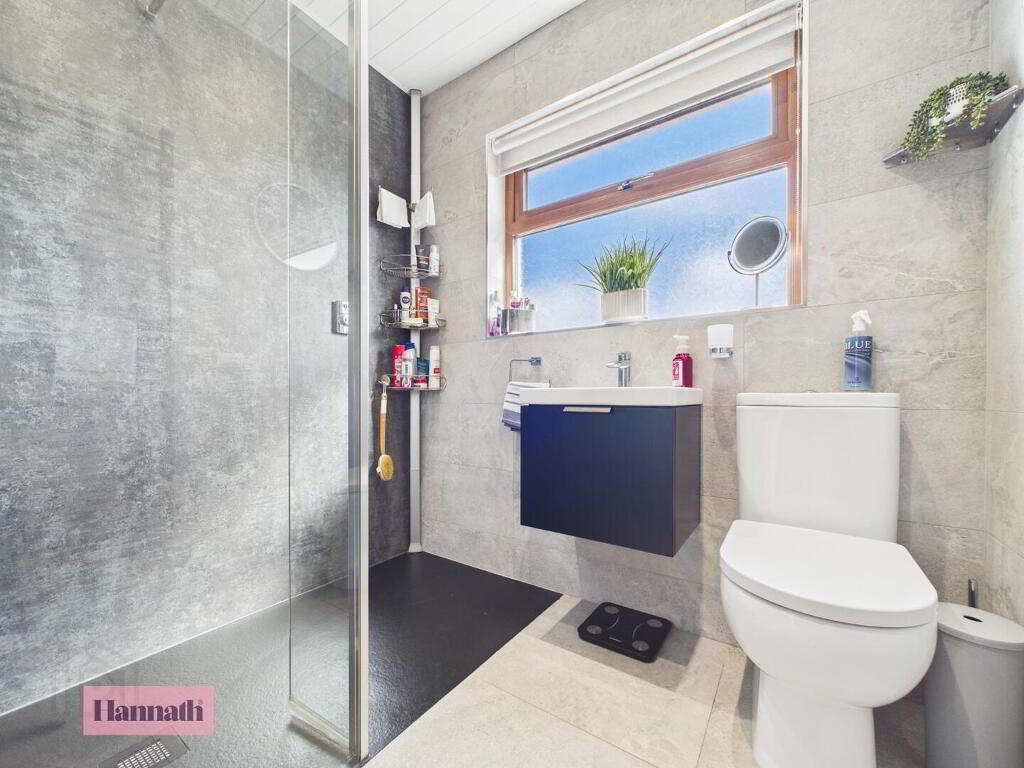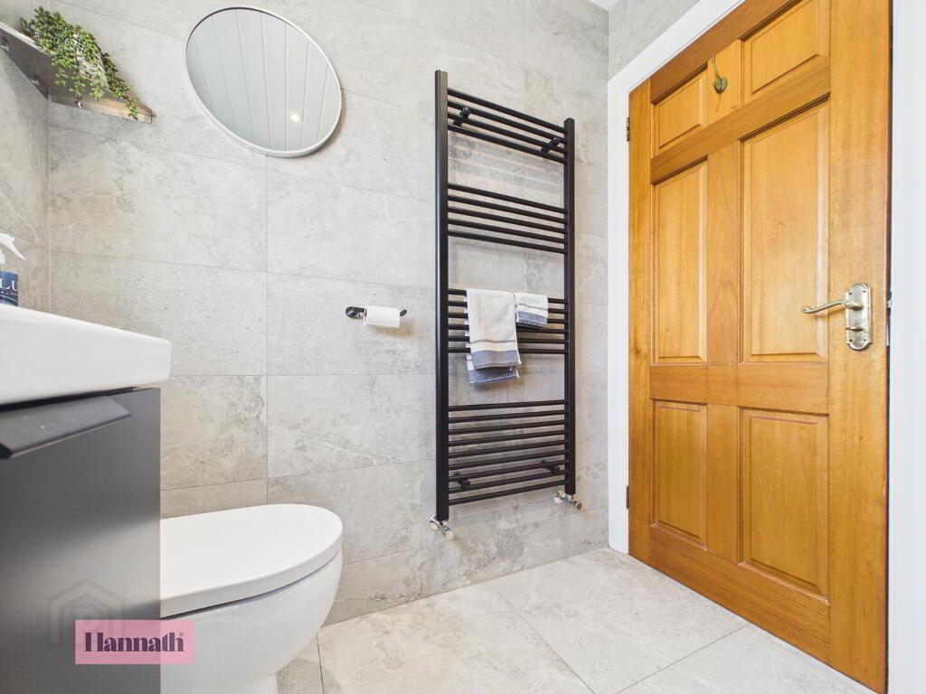 The bathroom is a well-appointed room with modern tiling on walls and floor. It features a walk-in shower with glass screen, a vanity basin with storage underneath, a toilet, and a heated towel rail.