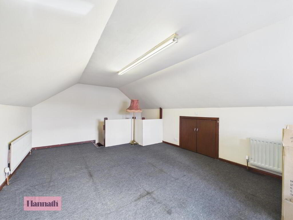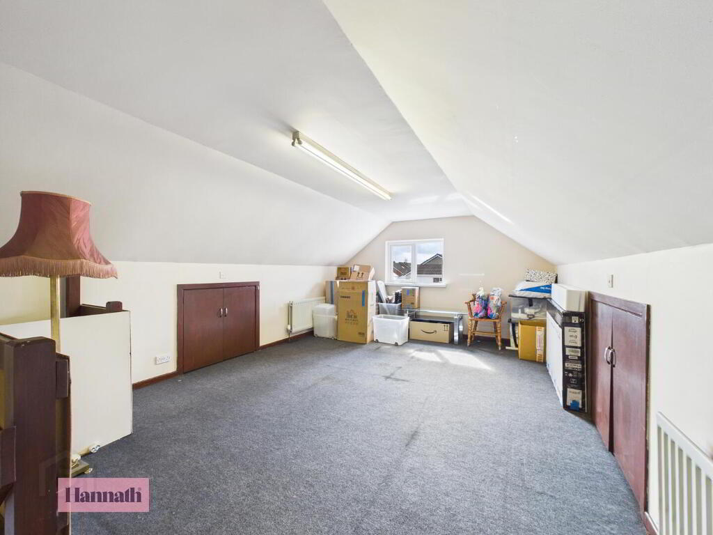 Upstairs in the garage is a spacious, carpeted room with a window providing natural light. This versatile space could be used as a gym, studio, or hobby room.