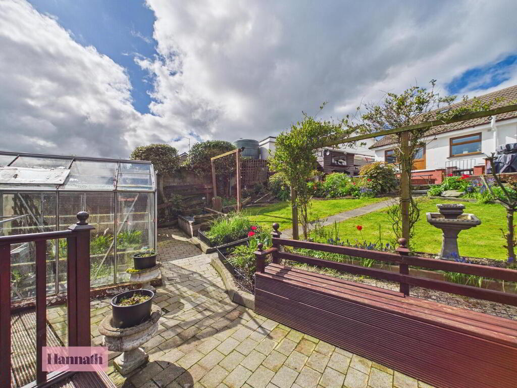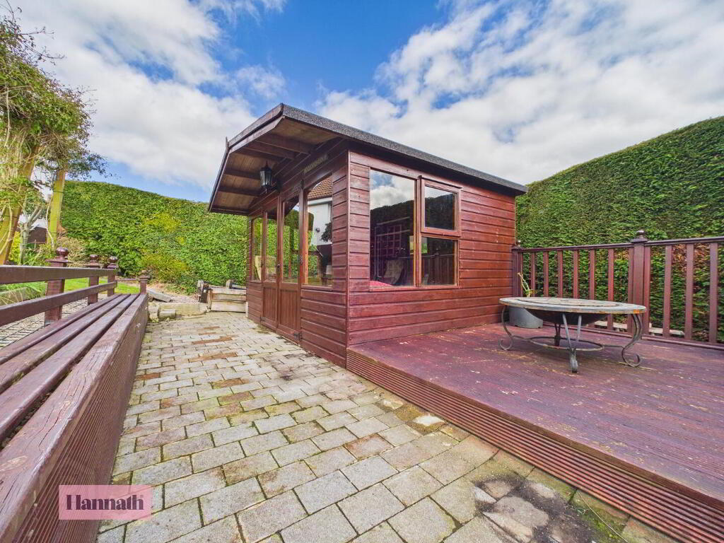 The rear garden is a well-maintained area featuring a paved patio, mature borders, and a lawn with a central pathway leading to a greenhouse and seating areas. It includes a wooden summer house and a raised deck with additional outdoor seating, creating an inviting space for gardening and relaxation.