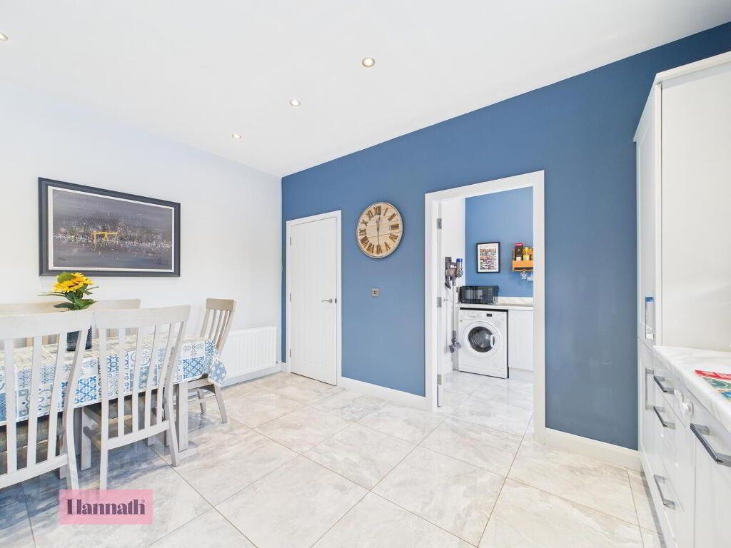 A bright kitchen/dining room with large tiled flooring and fresh white cabinetry contrasted by a deep blue accent wall. The kitchen is thoughtfully arranged with integrated appliances and plenty of storage. Adjacent to the kitchen is a utility room with matching flooring, fitted with essential appliances and a door leading outside.