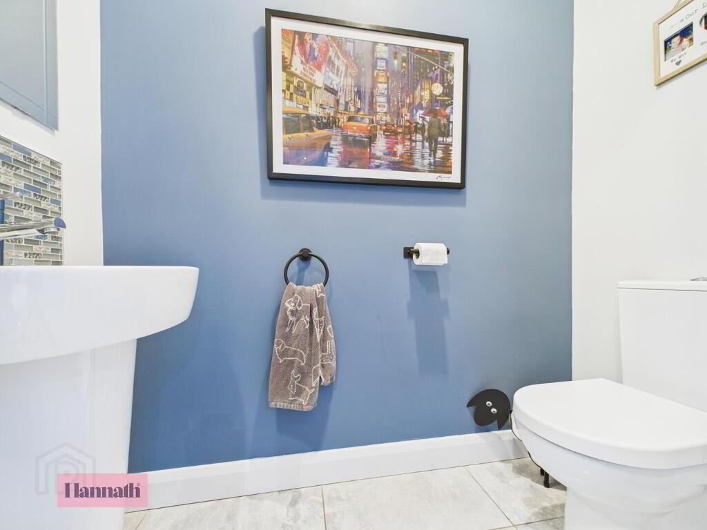 A modern ground floor WC with tiled flooring and a combination of white and blue walls. It offers a sleek white toilet and basin.