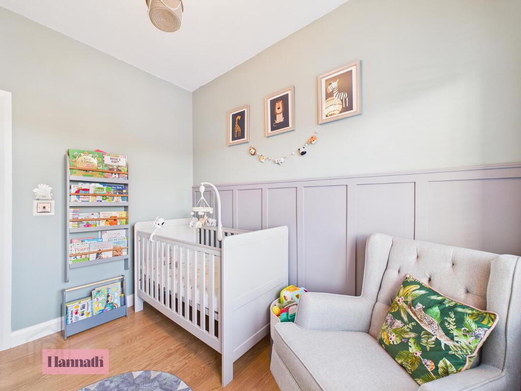 A third bedroom designed as a nursery, featuring wood-effect flooring and soft coloured walls.