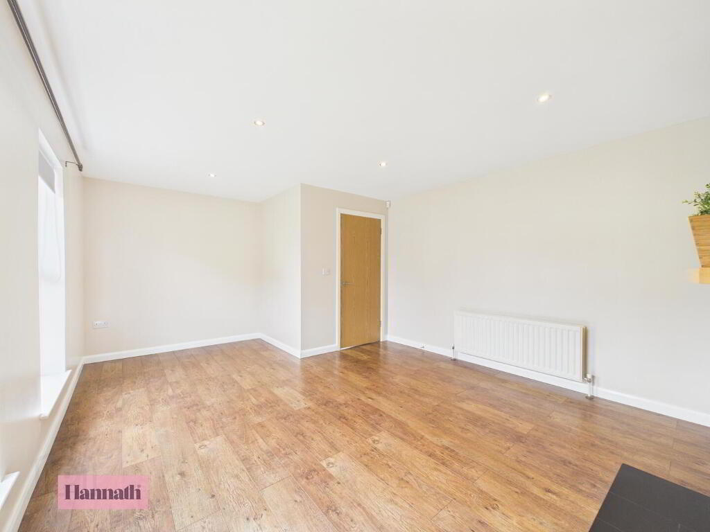 A spacious lounge offering plenty of natural light from two large double windows with views out to the front garden. The room is characterised by clean, neutral walls and warm wood flooring that runs throughout. A central fireplace with a modest wooden surround provides a cosy focal point, while recessed ceiling lights enhance the room's brightness.