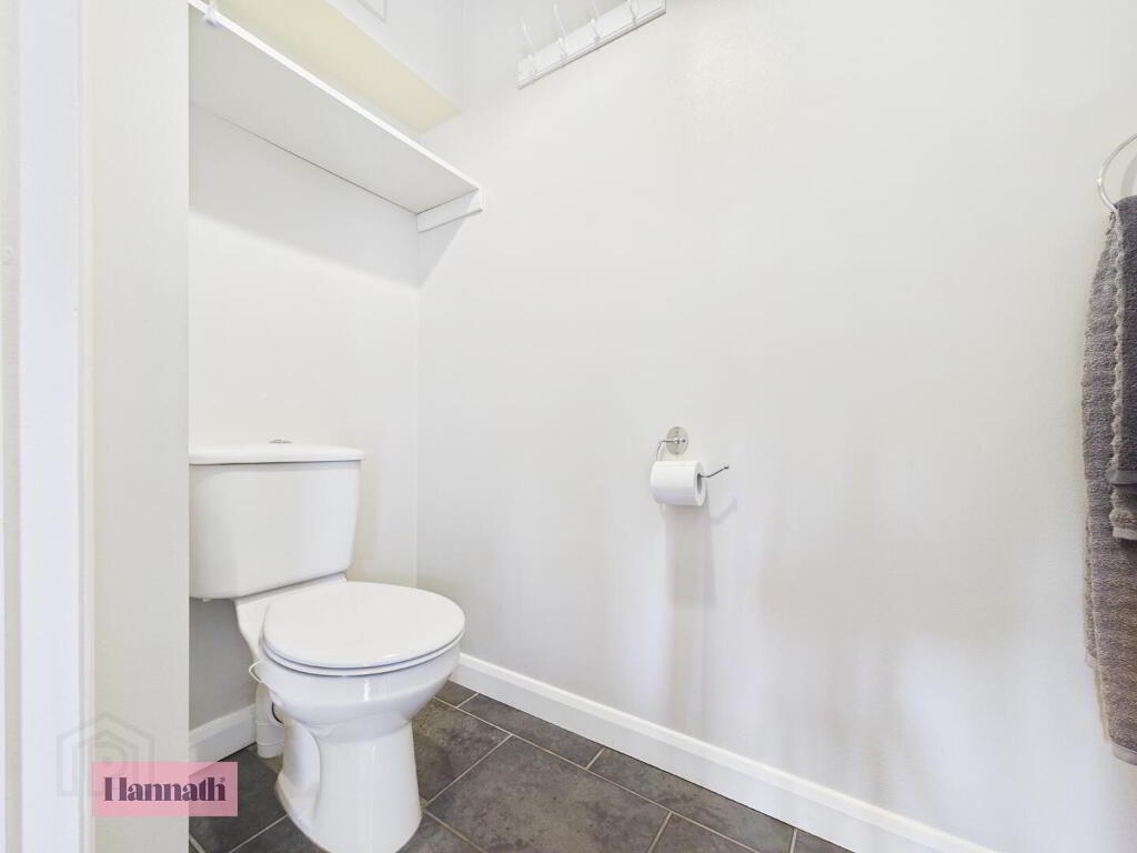 The main bathroom features a white suite with a bathtub, basin, and toilet. Dark tiled flooring contrasts with pale walls, and a window allows natural light to enter.