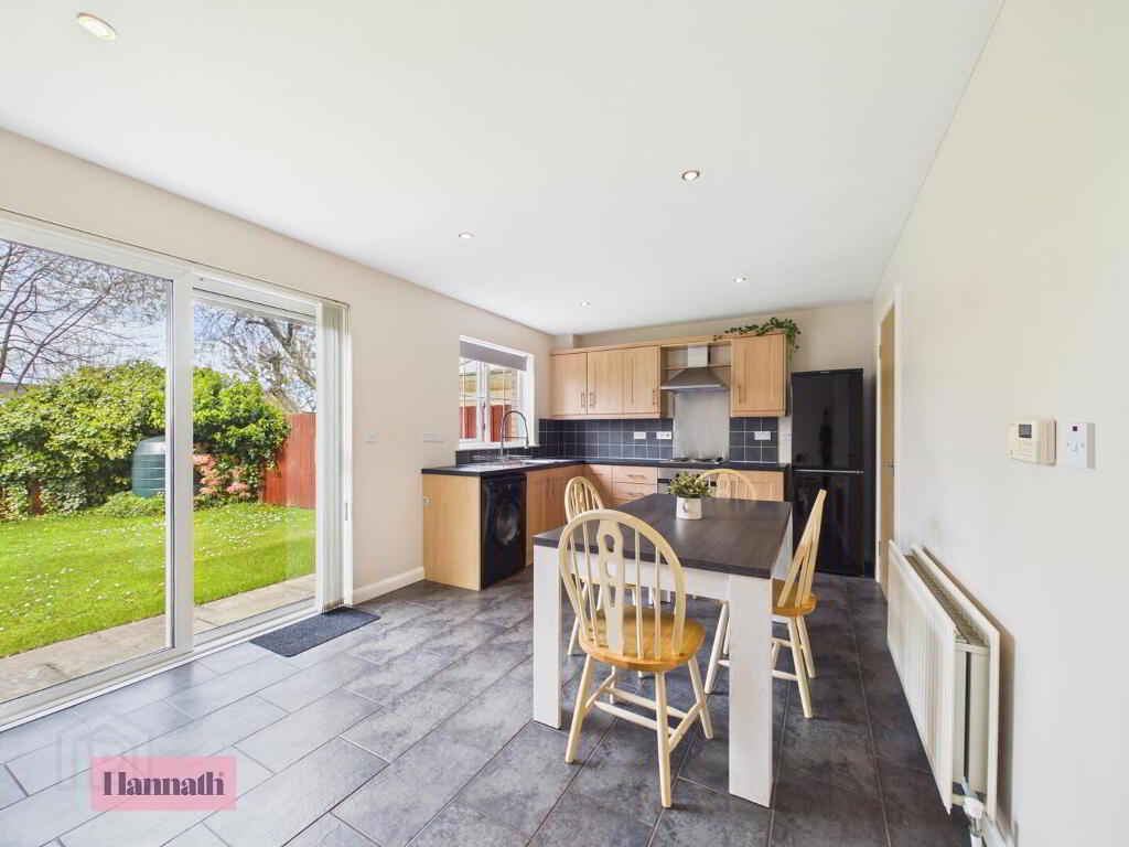 A good-sized, enclosed rear garden with a lawn bordered by a wooden fence and mature trees and shrubs, providing privacy and a peaceful outdoor space. A paved patio area just outside the kitchen provides an ideal spot for outdoor dining.