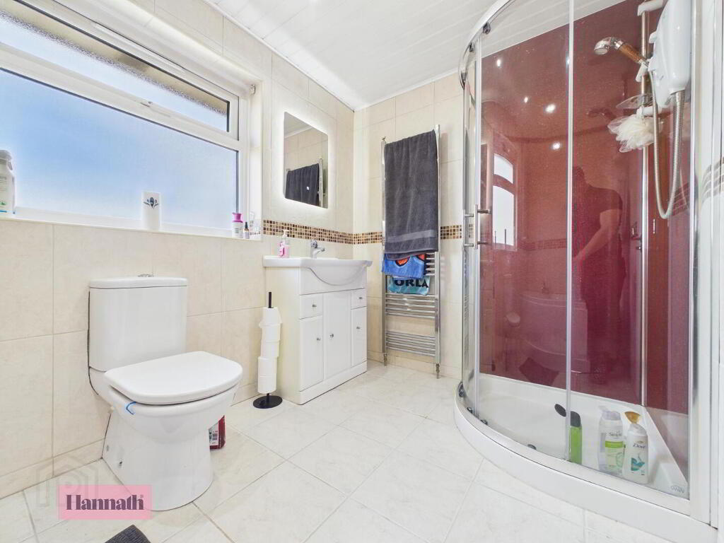The family bathroom is fitted with a white suite including a corner shower cubicle, vanity unit with wash basin, bath and a heated towel rail. Walls are tiled in neutral tones, with a window providing natural light and ventilation.