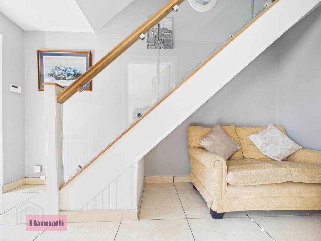 A welcoming hallway characterised by its glossy tiled flooring and neutral walls, creating a bright, airy entrance. The staircase features a modern glass and wood balustrade while the space under the stairs offers a space perfect for additional seating or storage.