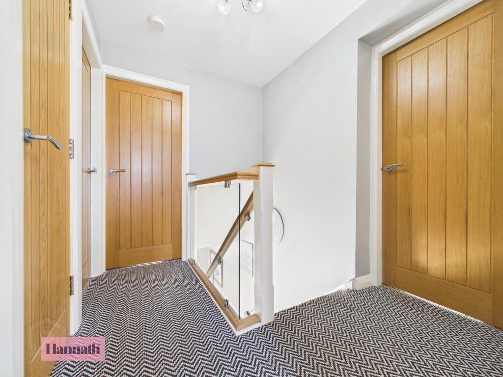 The first floor landing is carpeted with a subtle geometric pattern and provides access to all bedrooms and the family bathroom.